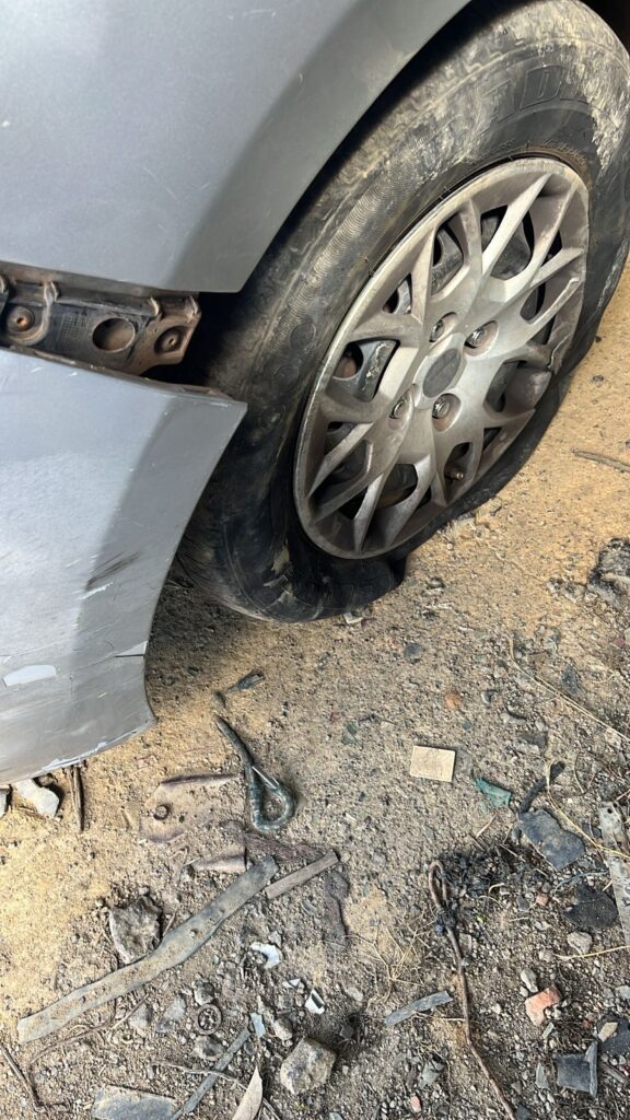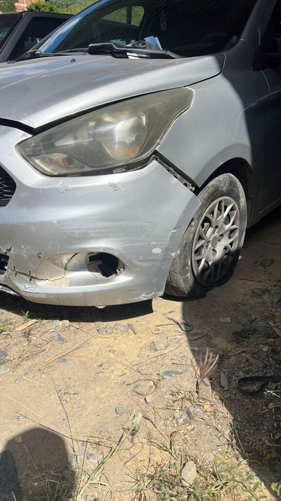 O veículo foi removido ao pátio pelo Auto-socorro Moraes, no bairro Córrego Alto. Nele, é possível observar as avarias provocadas pela colisão, como danos laterais na lataria e um dos pneus estourado.