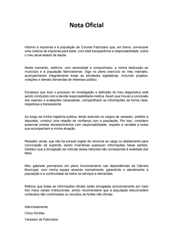 Por fim, a nota reforça que todas as informações oficiais serão divulgadas exclusivamente pelos canais institucionais do vereador. A recomendação é que a população desconsidere conteúdos não confirmados ou oriundos de fontes não oficiais. Com uma longa trajetória pública, tendo exercido os cargos de vereador, prefeito e deputado, Chico Simões destacou a relação de confiança construída com a população ao longo dos anos.