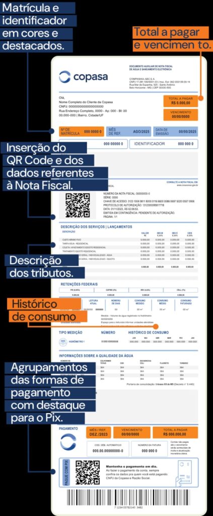 Visando cumprir as exigências da reforma tributária, a conta da Copasa passou por algumas adequações. Agora, a conta é documento auxiliar da Nota Fiscal de Água e Saneamento Eletrônica. Com o novo modelo, os clientes passam a ter acesso a informações claras e detalhadas de seu consumo e dos tributos destinados ao Estado, Município e União.